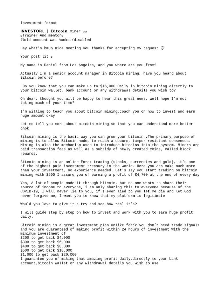The document is a solicitation for investment in Bitcoin mining, claiming potential daily earnings of up to $16,000 with minimal investment. The author, Daniel, offers to mentor and guide individuals through the investment process, assuring them of the legitimacy and safety of the venture. He emphasizes the high returns on investment and provides a breakdown of potential profits based on different investment amounts.