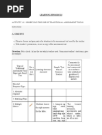 Ms. Jhenine L. Ragaas Subject Area: Araling Panlipunan Date: October 15, 2021 TARGET Your Intended Learning Outcome ➢ Observe the use of traditional assessment tools ➢ Critique the use of traditional assessment tools REVISIT the Learning Essentials ● Traditional assessment tools include paper-and-pencil tests, quizzes, short answer, matching, true or false, etc. ● These tools are commonly used to assess students' mastery of basic knowledge and comprehension. OBSERVE ● Observe how Mrs. Ragaas uses traditional assessment tools in assessing her Grade